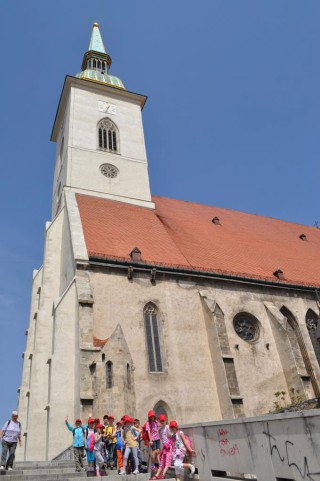 Strávili sme tam asi hodinu a pokračovali podľa plánu ďalej. Zastavili sme sa na Hodžovom námestí pred Grasalkovičovým palácom. Náš pán prezident bol zrejme doma, videli sme jeho štandardu i parádnu stráž. Podchodom - s eskalátormi (čo bolo pre nás dosť dôležité :-)) sme sa dostali na druhú stranu, aby sme pokračovali k Michalskej bráne. Jej vežu sme pozorovali už z diaľky. A objavili sme aj známe korunky na dlažbe - my sme vedeli, že tadiaľto v minulosti chodil nový korunovaný kráľ Uhorska. Našim bystrým a všímavým očkám hneď neunikol ani najužší dom v Bratislave a možno i v celej Európe. Susedí s Michalskou bránou a má len 130 cm. Dlho tam bolo kvetinárstvo, no my sme tam videli Kebab - to bola odlišnosť s fotkou, ktorú sme si ukazovali v pondelok. Pod Michalskou vežou bol opäť kilometrovník. V januári ho ukradli a do našej návštevy ho stihli urobiť znova. Mali sme tu hodinu matematiky :-) ... porovnávali sme vzdialenosti do rôznych miest a zistili sme, že do Viedne je odtiaľto najbližšie a do Sydney najďalej. Tu sme sa stali veľkou atrakciou pre iných turistov, asi boli z Kórey. Stále sa na nás usmievali, kývali nám, fotili sa s nami kde sme sa len pohli. Asi ich zaujali naše smajlíkové šiltovky :-) Korunky na dlažbe sme mali schované letnými terasami, ale tie, ktoré sme videli, nás priviedli až k miestu korunovácie uhorských kráľov - do Dómu sv. Martina. Zlatú korunu na vrchole veže tejto katedrály sme videli už z diaľky. Práve bola sv. omša, no my sa predsa vieme pekne slušne správať a ako myšičky sme vošli dovnútra, poklonili sme sa, očkami popozerali nádheru zvnútra, našli i sochu sv. Martina a po krátkej modlitbičke sme opäť tichučko pokračovali ďalej. P. učiteľka bola na nás hrdá, ako sme sa krásne v chráme správali. Pred kostolom sme zazreli ďalší bratislavský klenot - Dom u dobrého pastiera. Je to najužší dom v meste, ktorý stojí sám. Videli sme aj "dobrého pastiera" i falošné okno na dome. Po otočke nás vítal Most SNP (Nový most) so svojou reštauráciou Ufo. My už vieme kde sú schované schody a výťah :-) Neďaleku Dómu sv. Martina, priamo pri Gašparkovom divadle a soche A. Bernoláka sme si dali obed a pokračovali prehliadkou mesta ďalej. Zelenou ulicou sme prišli na Hlavné námestie a hneď zbadali fontánu, ktorú dal postaviť 1. korunovaný kráľ v Bratislave (Prešporku), Maximilián II. Volá sa Maximiliánova, alebo Rolandova - podľa rytiera, ktorý je na vrchu. Možno je to práve kráľ MaximiliánII. Dlho nám v hlavičkách vŕtala legenda, ktorú sme si hovorili. Ako sa len môže ten rytier na Nový rok otočiť, ako môže na Veľký piatok zísť dole? Nuž ... to hovorí legenda :-) Cestou ďalej na Hviezdoslavovo námestie sme sa odfotili so živým šašom - marionetou, s Čumilom a videli sme aj Schone Náciho. Pred SND sme hneď objavili zachované zvyšky Rybárskej brány i krásnu Ganymedovu fontánu s orlom, ktorý ho unáša na vrcho Olymp a 4 deti, ktoré držia dunajské ryby. Naša Klárinka hneď spoznala šťuku. Bol tam aj zubáč, kapor a sumec. Videli sme luxusný historický hotel Carlton i sochu Hviezdoslava. Trošku sme si zamaškrtili na zmrzlinke a dojedli sme ju až pri Dunaji. Tu skončila naša prehliadka mestom a pokračovali sme do Detského múzea na výstavu Ja a moje telo. Takmer celou cestou sme pozorovali Bratislavský hrad i Slavín. V múzeu sa asi všetkým najviac páčili ústa a hlavne jazyk, po ktorom sme sa šúchali von z úst :-) Vošli sme aj do ucha, do oka, do nosa a do prstov na ruke a naťahovali sme tenké črevo, aby sme zistili aké je dlhé.